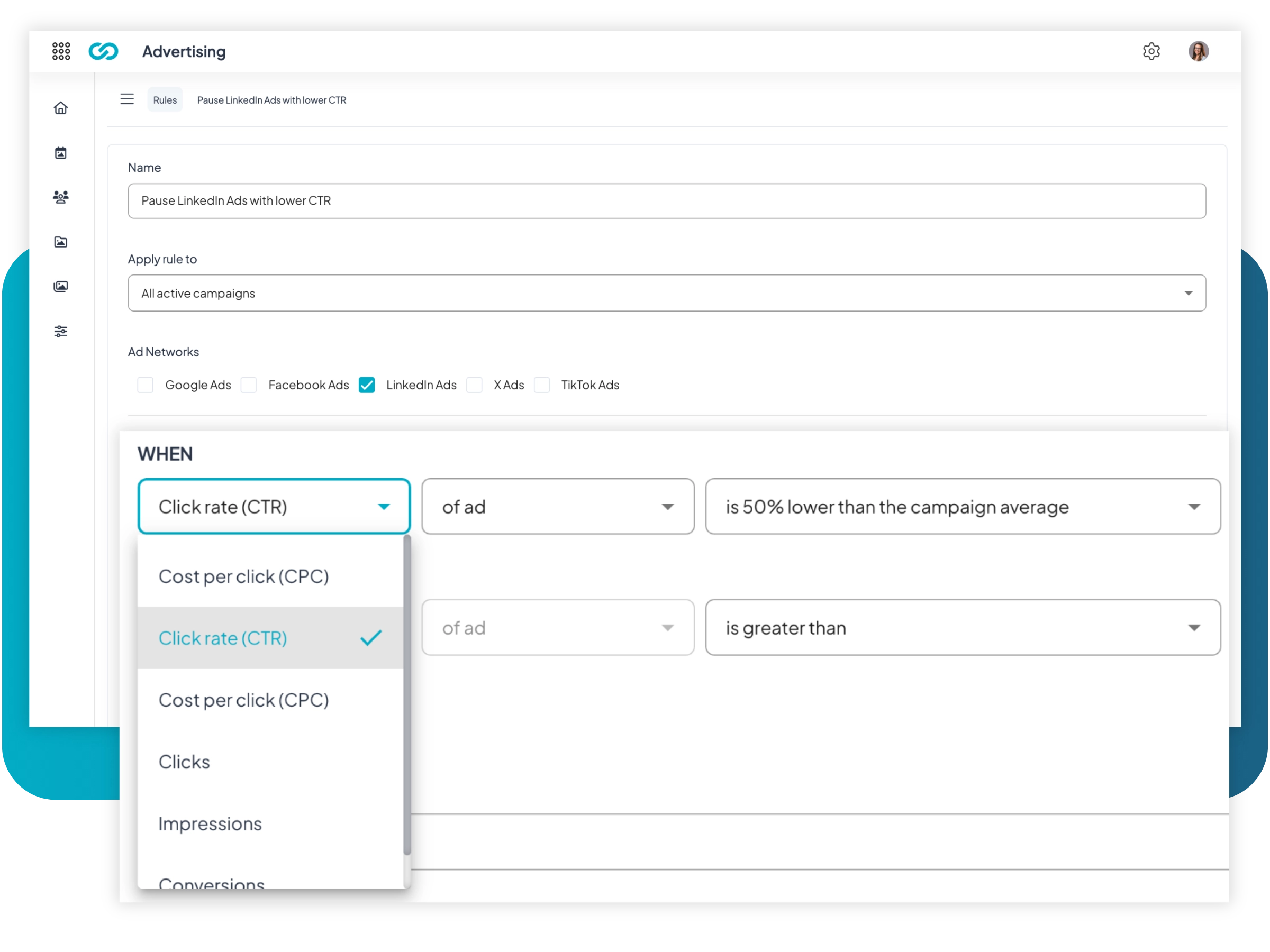 conditions and metrics such as click rate, cost-per-click or cost-per-conversion. You will