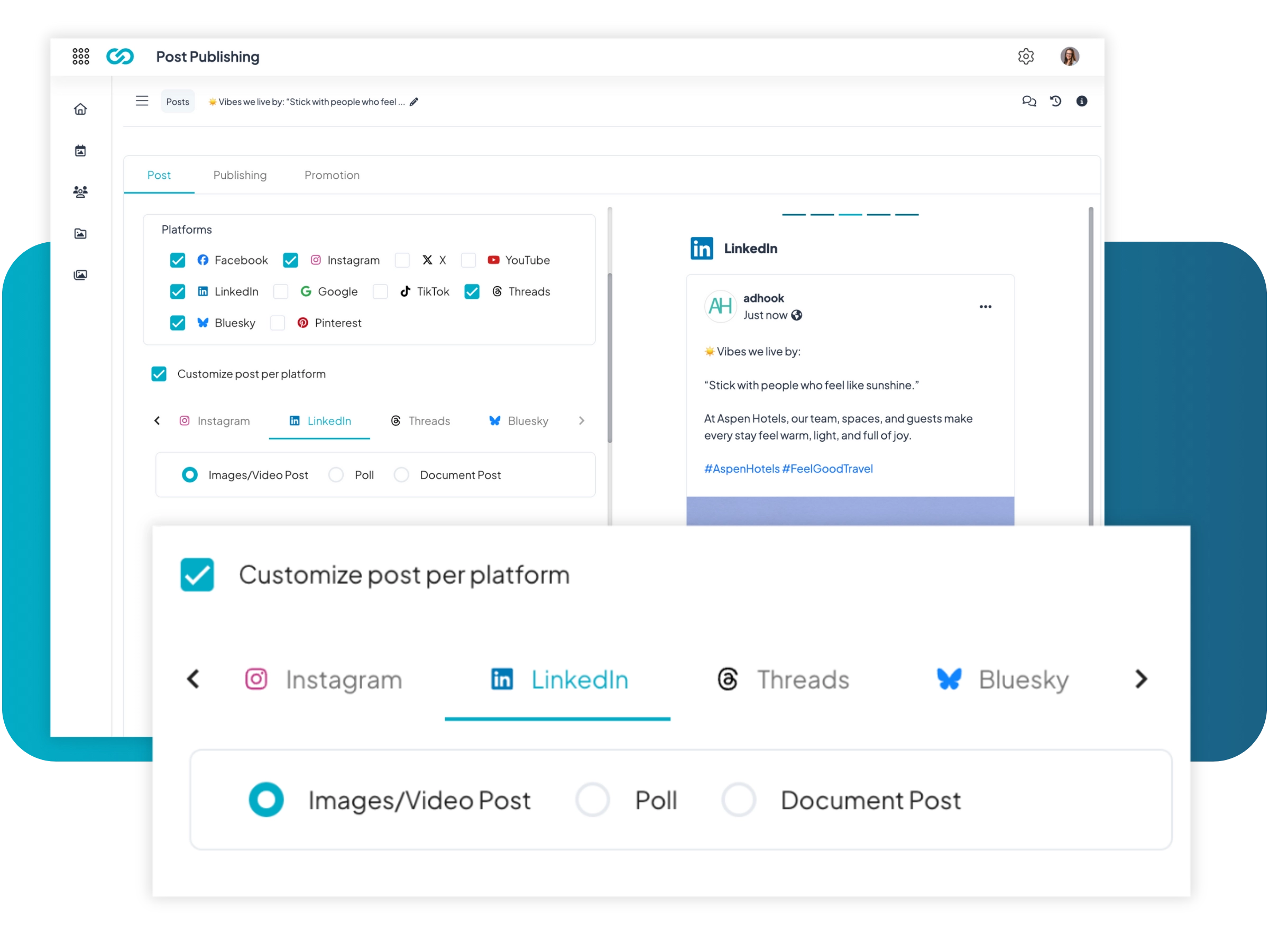 Mit Adhook veröffentlichst du Posts in allen Formaten der jeweiligen Plattformen. Das Format kann dazu individuell für jede gewählte Plattform im Post festgelegt werden. Folgende Formate werden unterstützt: