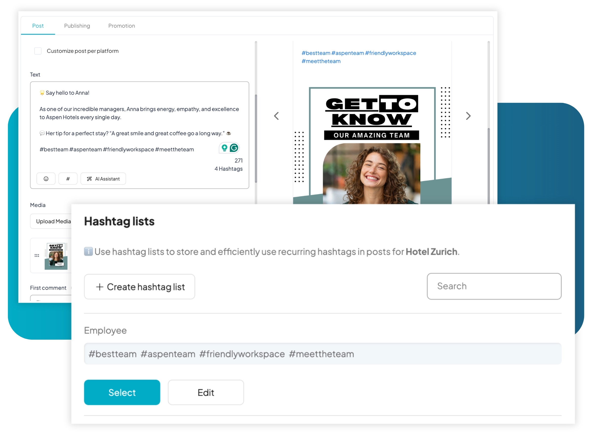 Nutze Hashtag Listen, um wiederkehrende Hashtags zu speichern und effizient in Posts einzusetzen. Die Hashtag Listen können sowohl in Post Vorlagen sowie in einzelnen Posts verwendet werden.