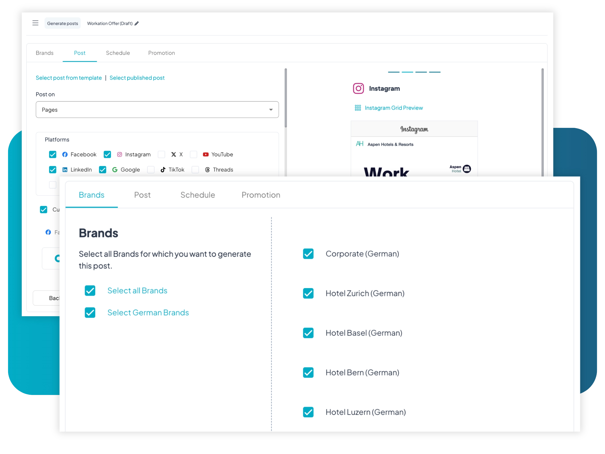 Mehr erfahrenPosts können von der Zentrale automatisiert für die Social Media Profile der Geschäftsstellen erstellt werden. Die Geschäftsstelle wird je nach Wunsch mehr oder weniger in die Erstellung der Inhalte involviert. Anwendungsfälle: