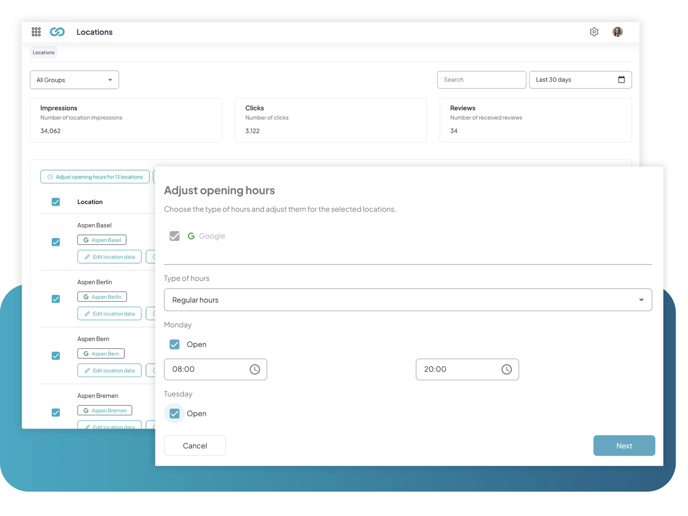 Un jour férié local ou des horaires d'été modifiés ? Avec Adhook, tu n'as pas à modifier chaque filiale individuellement. Sélectionne les emplacements concernés et mets à jour leurs informations en une seule opération.